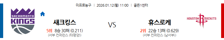 | 11:00 | 새크라멘토 | 112 – 122 | 휴스턴 | 오버 |