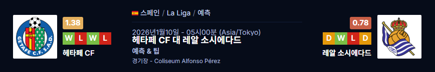 헤타페는 공식전 5경기 연속 승리가 없고, 이 가운데 3경기에서 득점에 실패하며 공격에서 심각한 가뭄을 겪었다. 소시에다드는 13경기 중 3패밖에 없지만, 리그 기준 최근 5경기에서 승리가 없고, 원정에서도 9경기에서 승점 7점에 그치며 원정 성적이 순위를 끌어내리는 중이다. 그래도 소시에다드는 4경기 연속 득점에 성공하는 동안 5경기 연속 실점을 허용하고 있고, 헤타페는 최근 7경기 중 6경기가 2.5골 언더로 끝날 만큼 ‘답답하지만 쉽게 무너지지 않는’ 팀이라는 점에서, 저득점 접전 양상이 자연스럽게 떠오른다.