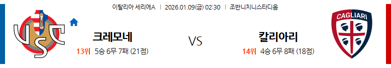 - 최근 3경기 성적: 크레모네세 0승 0무 3패, 칼리아리 3승 0무 0패